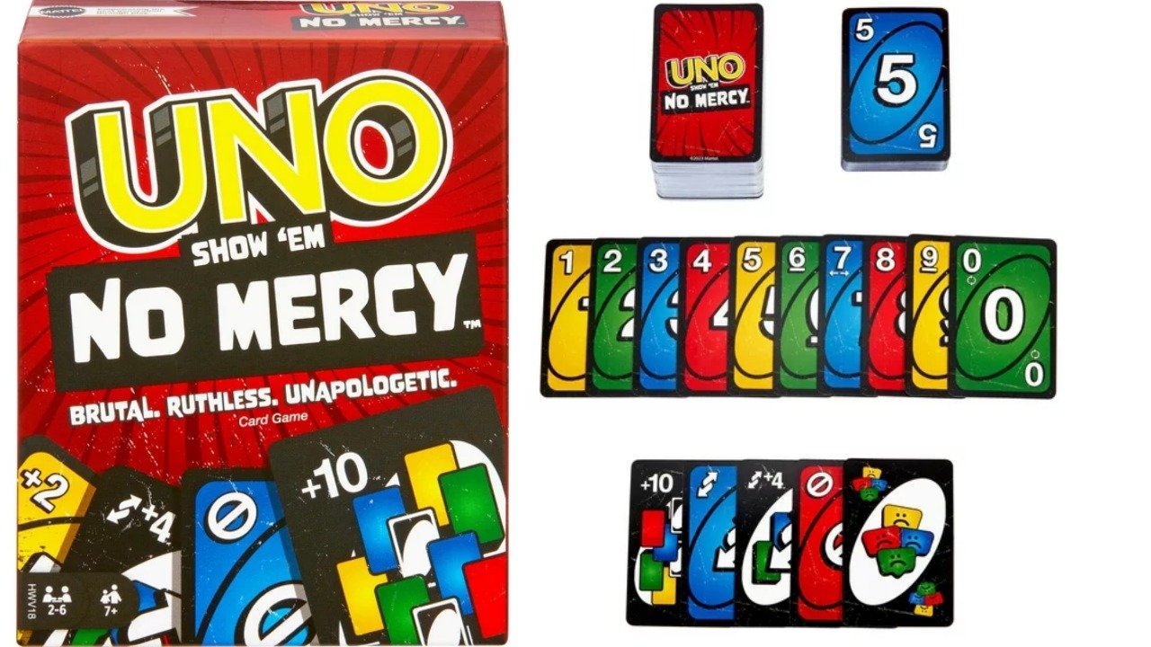 A detailed look at the rules for how to play UNO Show 'Em No Mercy a 2023 family party card game published by Mattel. UNO Show 'Em No Mercy is a new card game from Mattel that adds more cards, rules, and challenges to the classic UNO game Learn how to play UNO Show Em No Mercy, the fast-paced UNO game with new Action Cards and special rules! Discover card meanings, stacking rules, and how to knock out your opponents to win